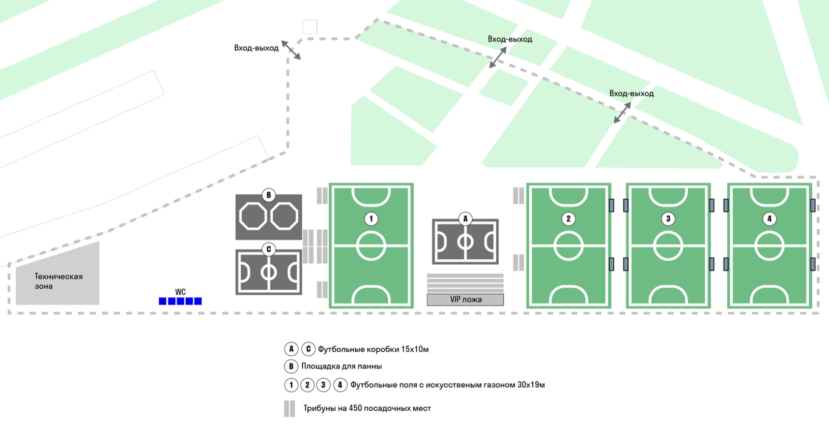 • 4 мини-футбольных поля 30х19 с искусственным газоном 40 мм